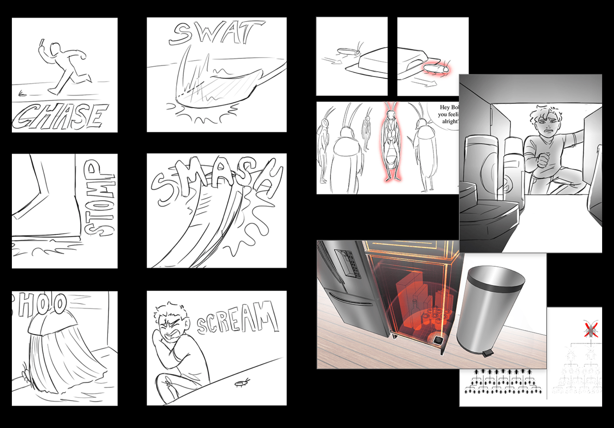The biggest challenge during production was bringing the roaches to life without using real bugs. Actors had to convincingly interact with imaginary pests while we digitally created the roaches in post, ensuring none were harmed. Precision in timing, reactions, and choreography was critical to make the scenes feel real and deliver the 3-Second WOW while clearly communicating the product’s effectiveness.